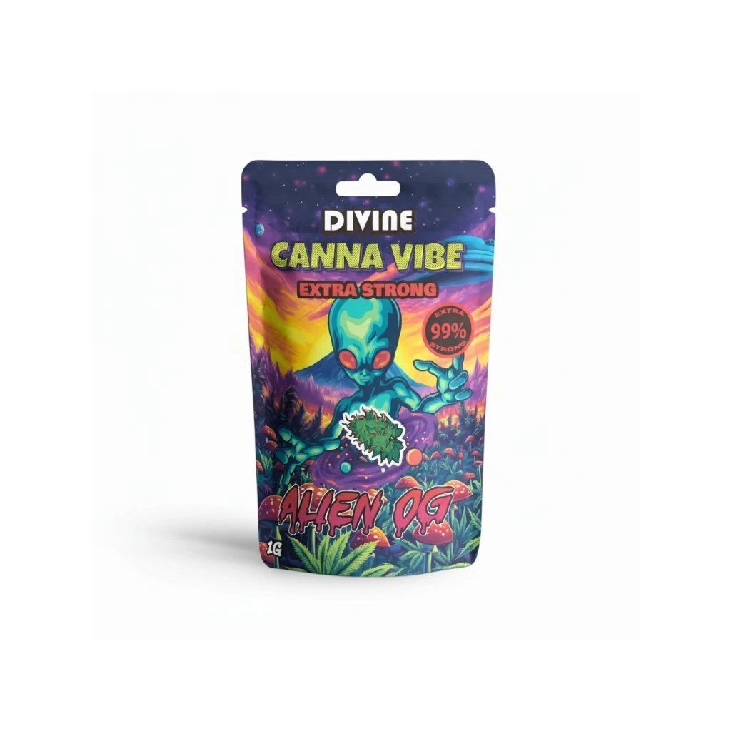 Divine – Canna Vibe květ 1g – Alien OG 99% je sušený konopný květ s deklarovaným obsahem CBD 99 %. Spadá do kategorie CBD květů a jedná se o koncentrovanější variantu určenou pro zkušenější uživatele.