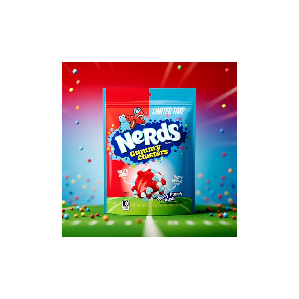 Nerds Clusters NFL Cherry Raspberry Touchdown jsou bonbony tvořené křupavými cukrovými kousky Nerds obalenými kolem měkkého středu. Balení obsahuje 113 g sladkostí.