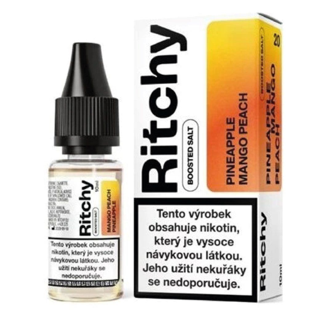 Ritchy Pineapple Mango Peach 10 ml je e-liquid s nikotinovou solí určený pro MTL pod systémy a zařízení s nižším výkonem.